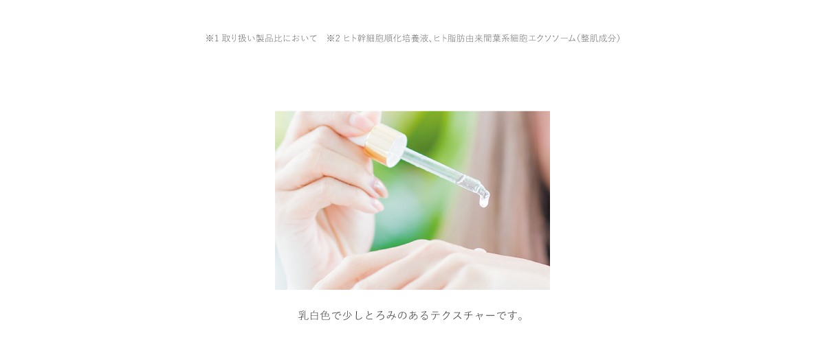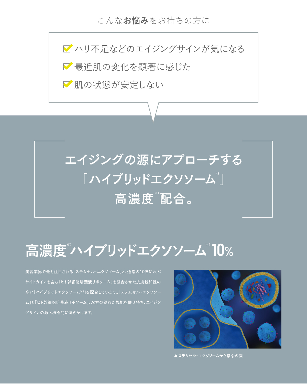成分 水、ヒト幹細胞順化培養液、BG、規定化細胞培地9、ヒト脂肪由来間葉系細胞エクソソーム、グリセリン、1,2-ヘキサンジオール、トリ(カプリル酸/カプリン酸)グリセリル、キサンタンガム、酢酸トコフェロール、水添レシチン、(アクリロイルジメチルタウリンアンモニウム/VP)コポリマー、ポリソルベート80、カプリリルグリコール、フェノキシエタノール