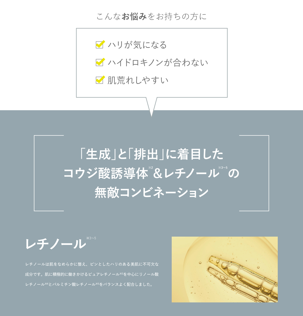 成分 水、パルミチン酸エチルヘキシル、ジパルミチン酸コジク、スクワラン、BG、グリセリン、パンテノール、セテアリルアルコール、セタノール、トコフェロール、加水分解ヒアルロン酸Na、セテアリルグルコシド、テトラヘキシルデカン酸アスコルビル、ナイアシンアミド、ラウロイルグルタミン酸ジ(フィトステリル/オクチルドデシル)、パルミチン酸レチノール、リノール酸レチノール、(アスコルビル/トコフェリル)リン酸K、リン酸アスコルビルMg、セラミドNG、セラミドAP、セラミドAG、セラミドNP、セラミドEOP、フィトステロールズ、PCA-Na、グリチルレチン酸ステアリル、グラブリジン、レチノール、アラントイン、コーン油、ビサボロール、ヘキサ(ヒドロキシステアリン酸/ステアリン酸/ロジン酸)ジペンタエリスリチル、シクロデキストリン、PEG-60水添ヒマシ油、カルボマー、ジメチコン、ポリソルベート20、アセチルシステイン、水添レシチン、リボフラビン、水酸化K、1,2-ヘキサンジオール、フェノキシエタノール